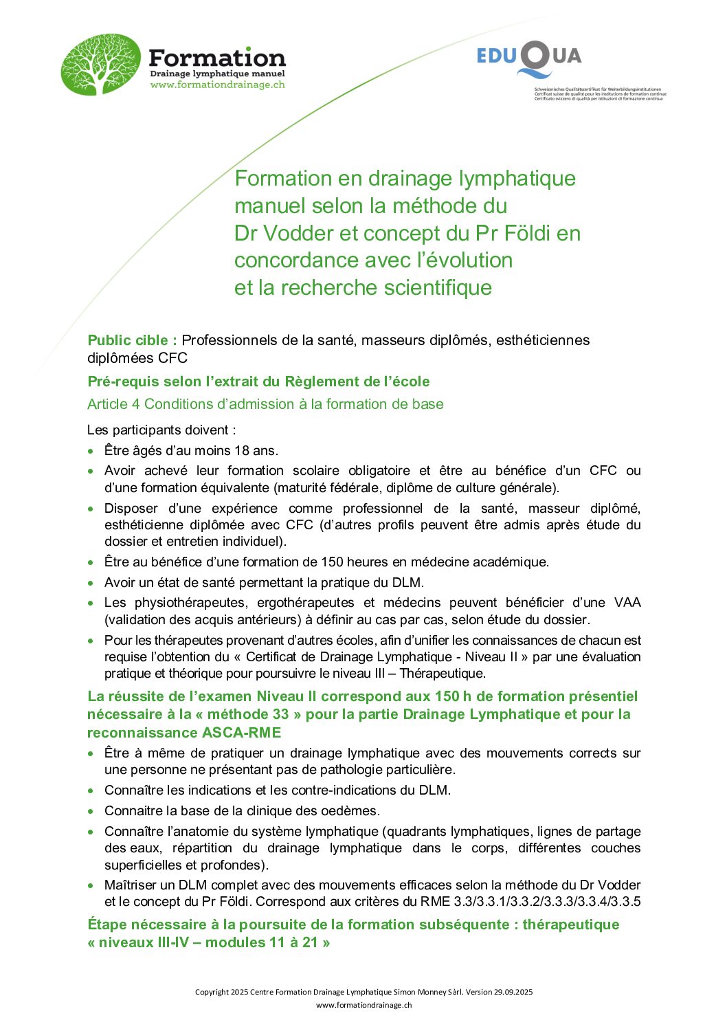 Cette formation permet d’acquérir une maîtrise complète du drainage lymphatique manuel sur une personne en bonne santé. Le participant apprend les mouvements fondamentaux issus des approches Vodder et Földi, en lien avec la physiologie du système lymphatique (quadrants, nœuds lymphatiques, couches superficielles/profondes).
